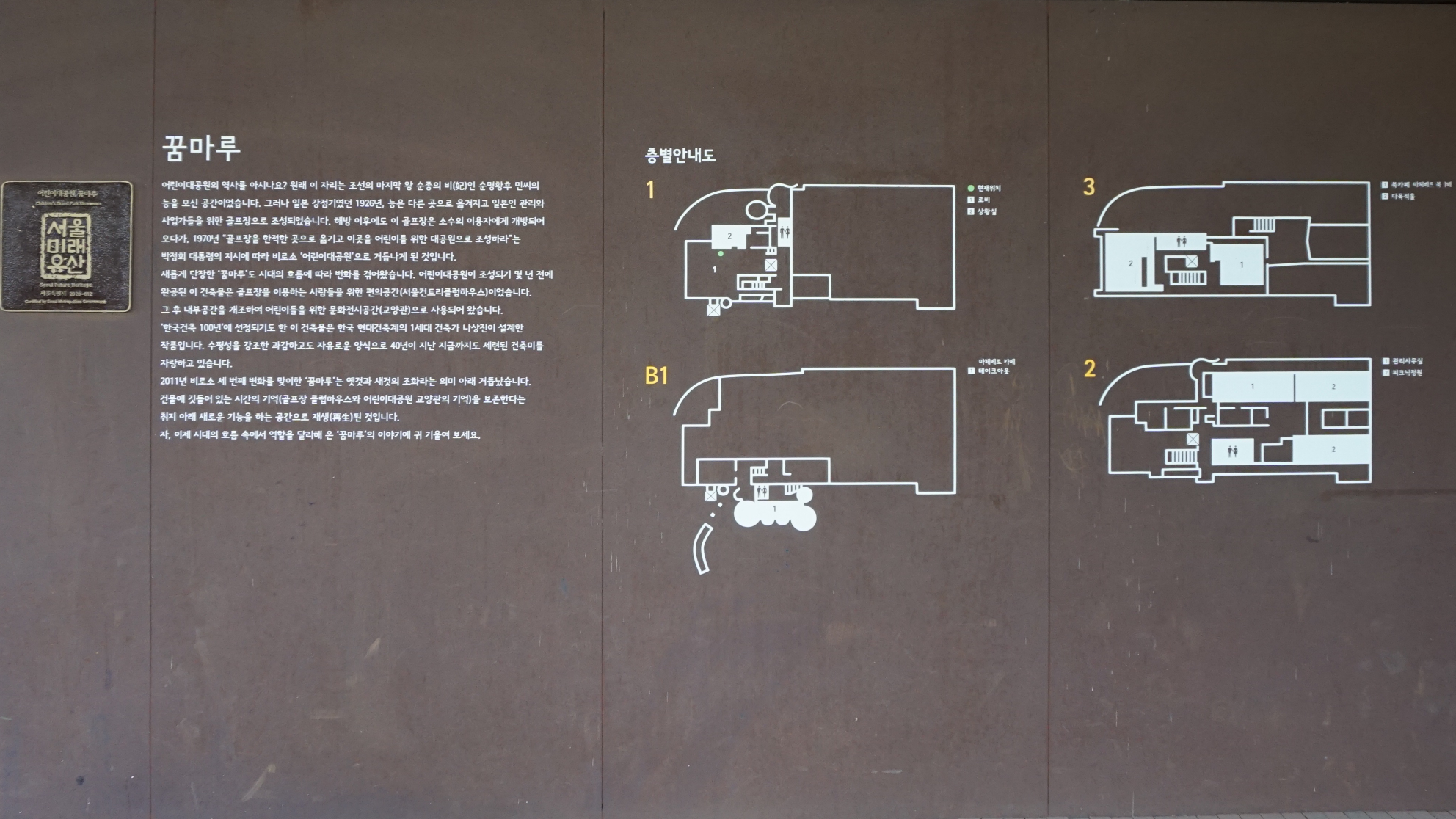 이후 1973년 어린이대공원이 개원하면서 이 건물은 교양관, 전시관, 식당, 관리사무소 등 다양한 용도로 사용되었지만 점차 노후화된 건물은 철거 위기에 처하기도 하였습니다. 하지만 2011년 조성룡, 최춘웅 건축가에 의해 리노베이션이 진행되었습니다. 이렇게 탈바꿈한 건물이 지금의 ‘꿈마루’입니다.
