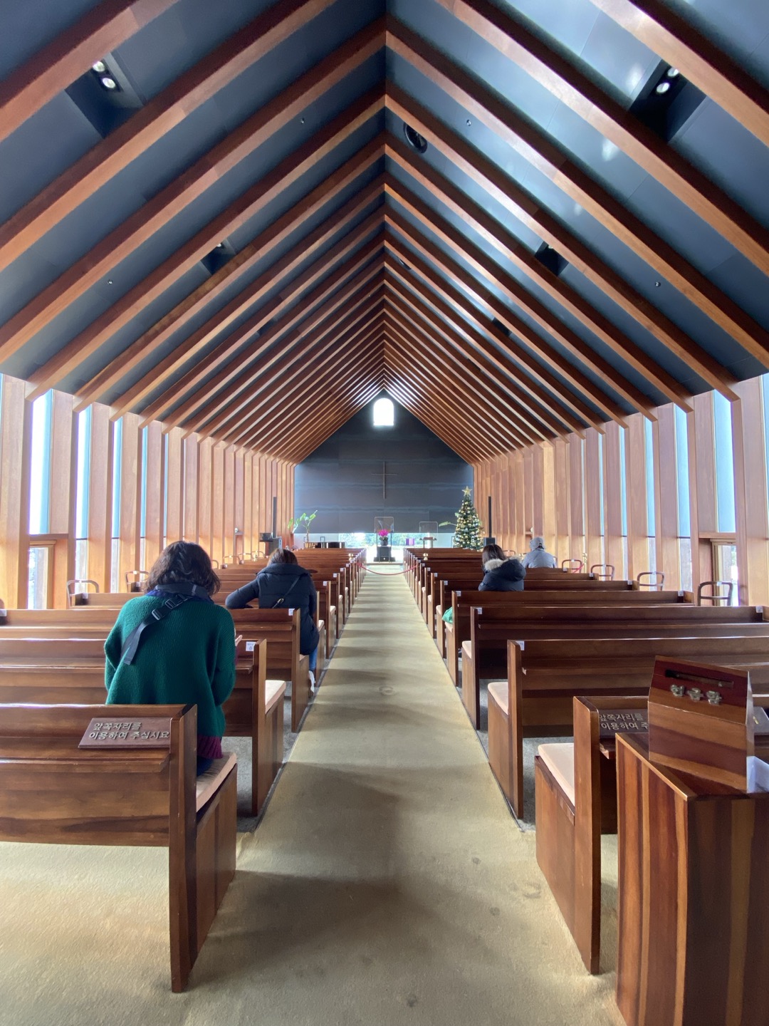 방주교회는 이름 그대로 노아의 방주를 모티브로 만들어진 교회입니다. 건물 주변으로 있는 수공간은 건물이 마치 물위에 떠 있는 것 같은 느낌을 줍니다. 수공간을 지나 내부로 들어서면 은은하게 들어오는 자연광이 환하게 실내를 비춥니다. 건물주변의 수공간을 통해 반사되어 들어오는 빛은 은은하게 내부를 비쳐주기도 하며, 천장에 영롱한 그림자를 남기며 성스러운 공간의 분위기를 더해줍니다. 이 교회의 설계 컨셉은 ‘하늘의 교회’라고 합니다. 인상적인 지붕은 세가지 색깔의 징크소재로 만들어졌는데 반짝이는 하늘의 모습을 담기 위한 디자인 요소입니다. 또한 시시각각 변하는 하늘의 모습을 비추는 수공간, 그 수공간을 통해 반사되는 빛과 그림자 또한 이타미준이 건축물을 통해서 하늘을 담는 방식이었습니다.
